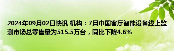 2024年09月02日快讯 机构:7月中国客厅智能设备线上监测市场总零售量为515.5万台,同比下降4.6%