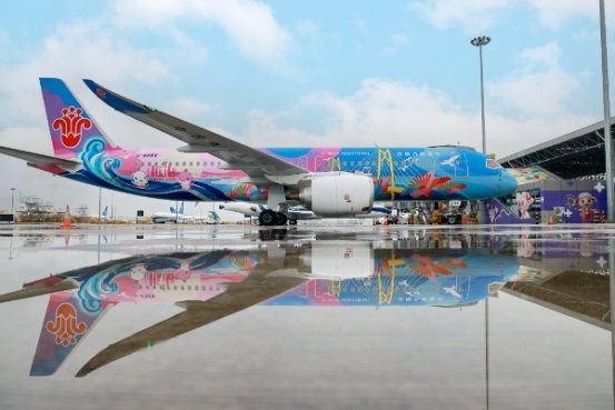 南航“大美湾区号”作为第十五届全国运动会及残特奥会的主题彩绘机,堪称展现粤港澳大湾区魅力的“空中艺术品”。阿克苏诺贝尔凭借其先进的色彩开发能力和航空涂料技术,将港珠澳大桥、岭南文化底蕴象征物、南航木棉花标志等元素以44种斑斓色彩完美呈现于机身。它的亮相,不仅是一场视觉盛宴,更标志着国产大飞机在商业化运营与文化艺术表达上迎来新的突破。